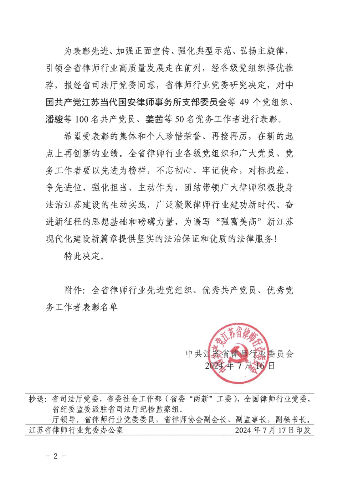 2024年7月,中共江苏东臻律师事务所支部委员会被评为江苏省律师行业“先进党组织”。这不仅是对中共江苏东臻律师事务所党支部全体党员及全体同仁党建工作的高度肯定,更是对中共江苏东臻律师事务所党支部坚持党的领导、践行法治精神、服务人民群众的生动诠释。